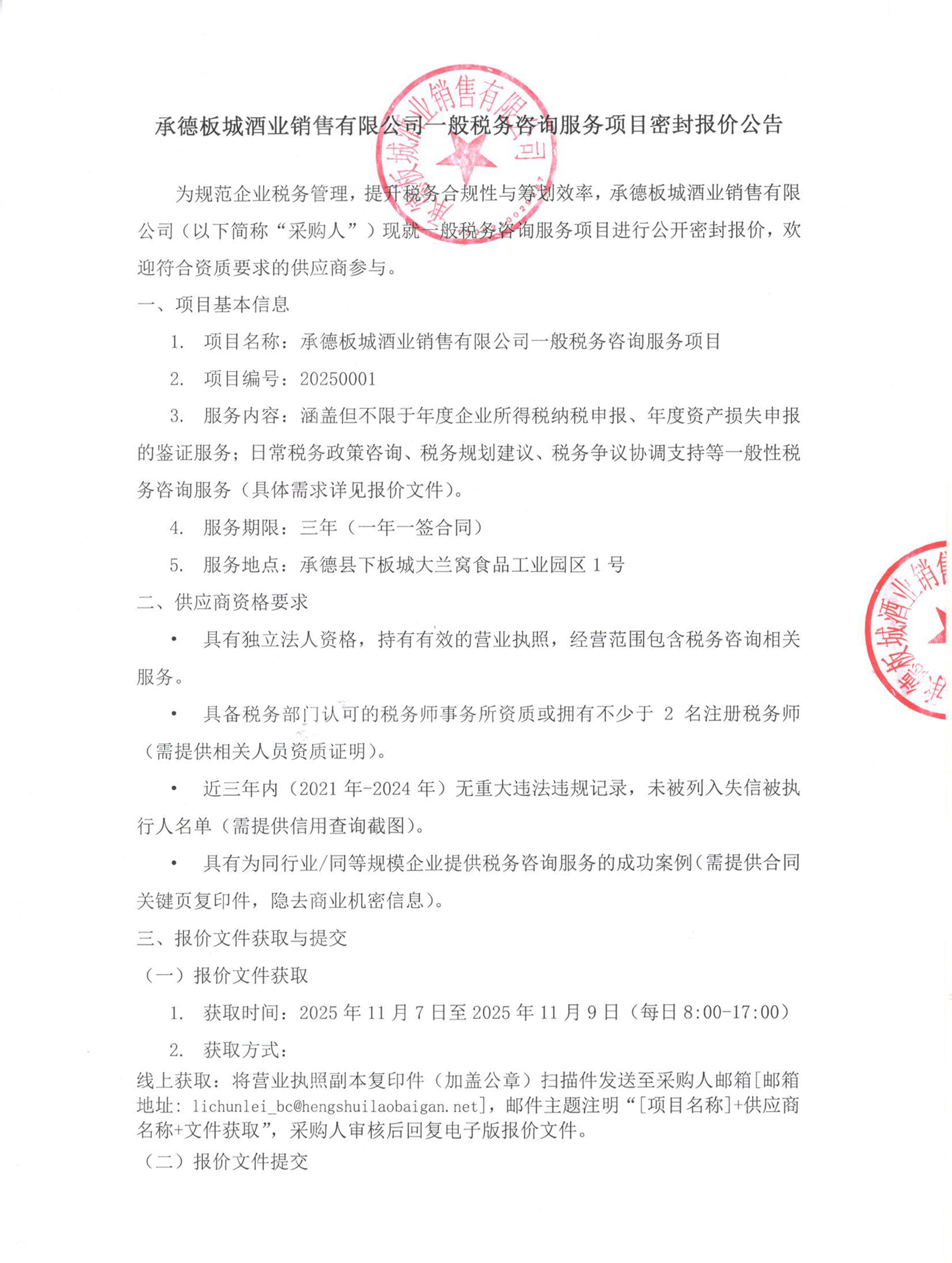 承德板城酒業(yè)銷售有限公司一般稅務(wù)咨詢服務(wù)項目密封報價公告